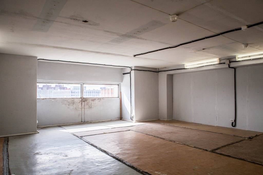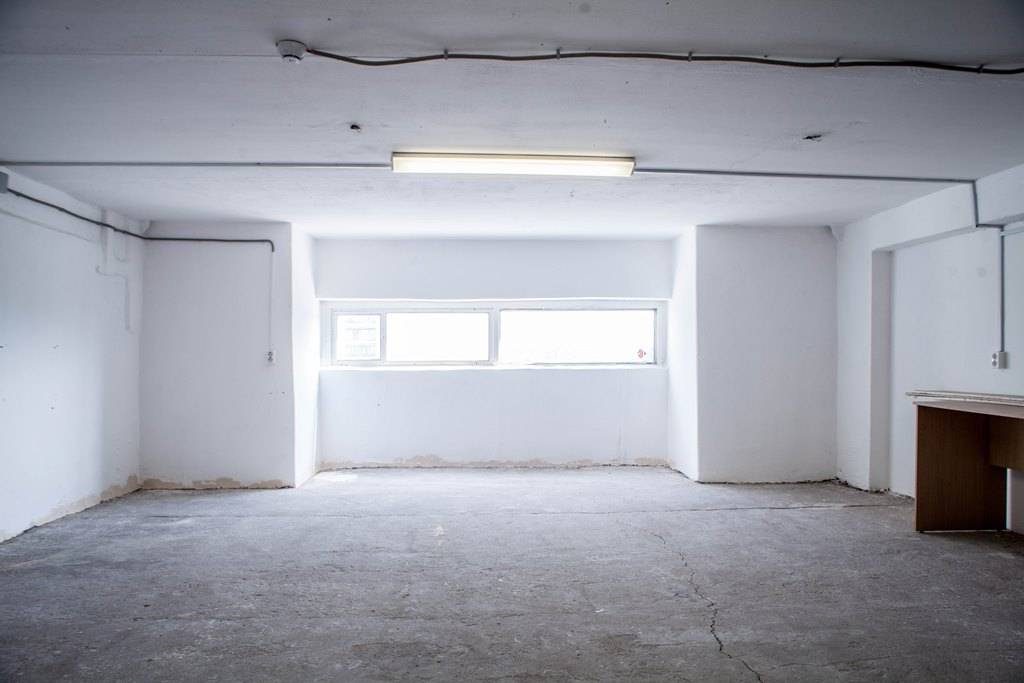 Отделка: окрашенные стены/ обои, напольное покрытие - ровный бетон/линолеум, много больших окон.