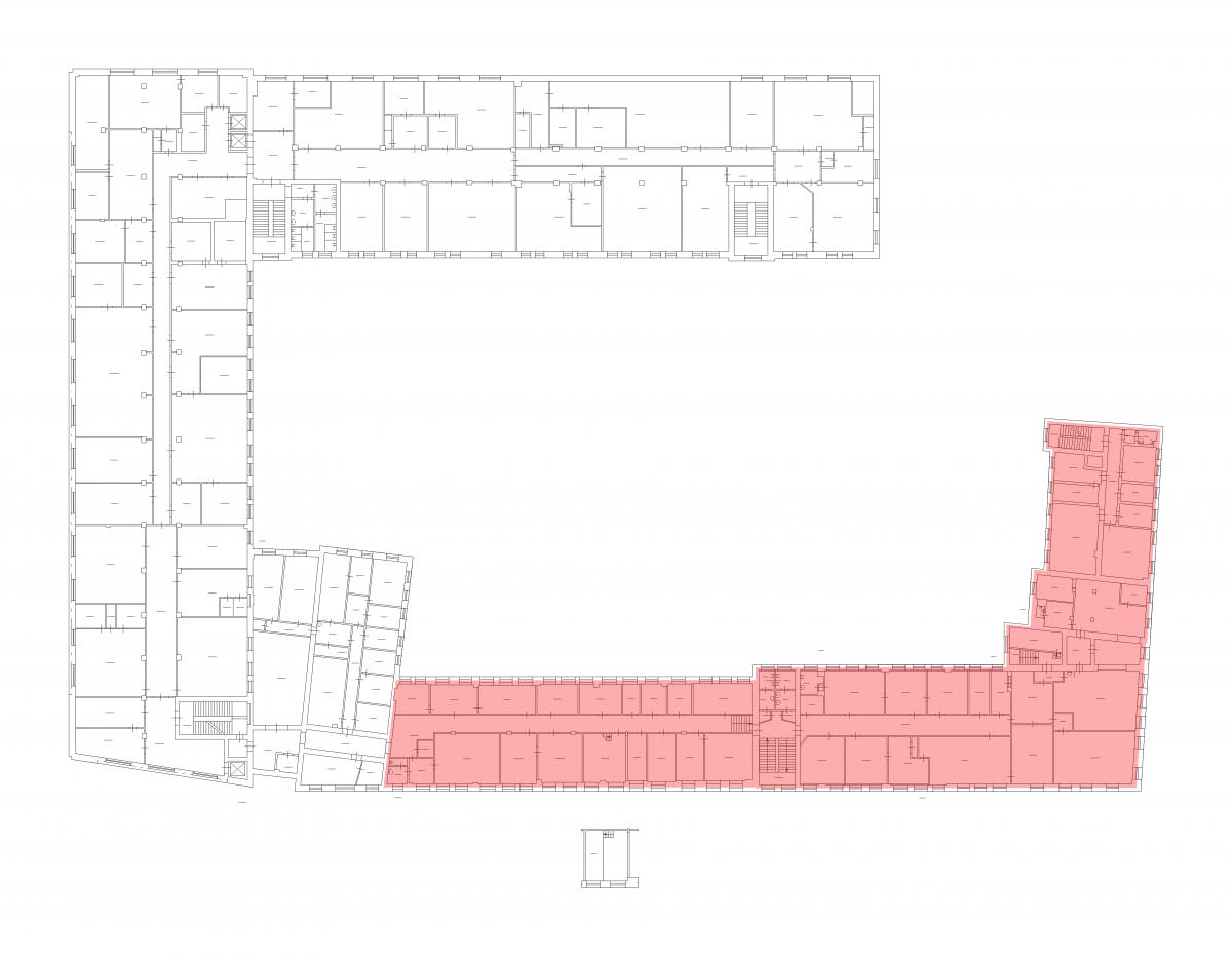 Блок включает помещения кабинетной планировки, места общего пользования.