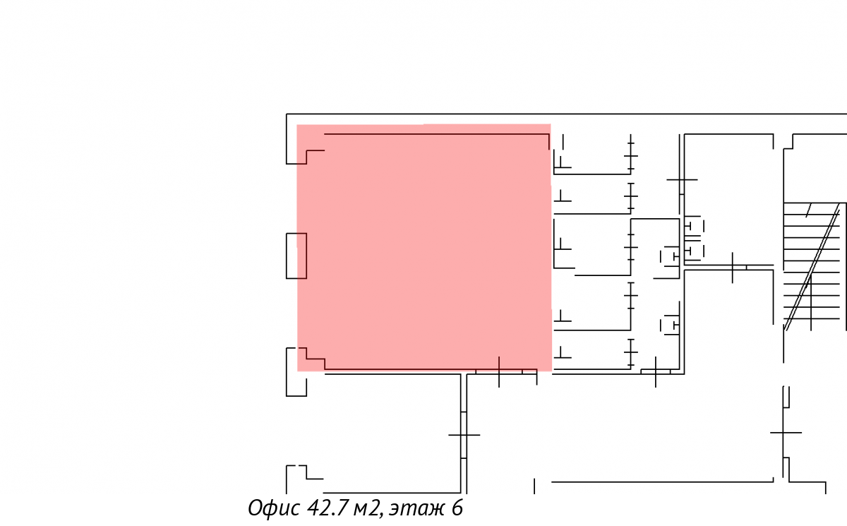 Помещение площадью 42.7 кв. м расположено на 6-м этаже БЦ "К2".