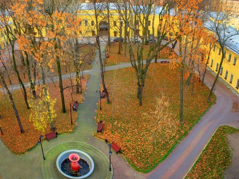 Внутренняя территория включает в себя парк с зелеными насаждениями и фонтаном.