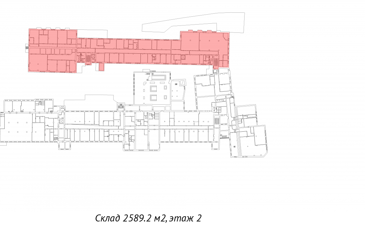 Площади располагаются на первом и втором этажах одного из зданий комплекса.