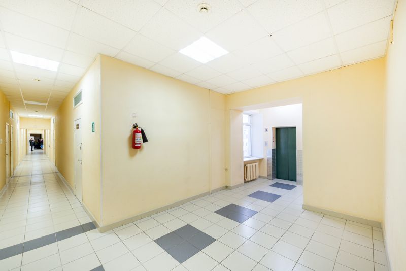 В здании работает лифт с грузоподъёмностью 630 кг и габаритами 1,04 х 2,16 х 2,1 м.